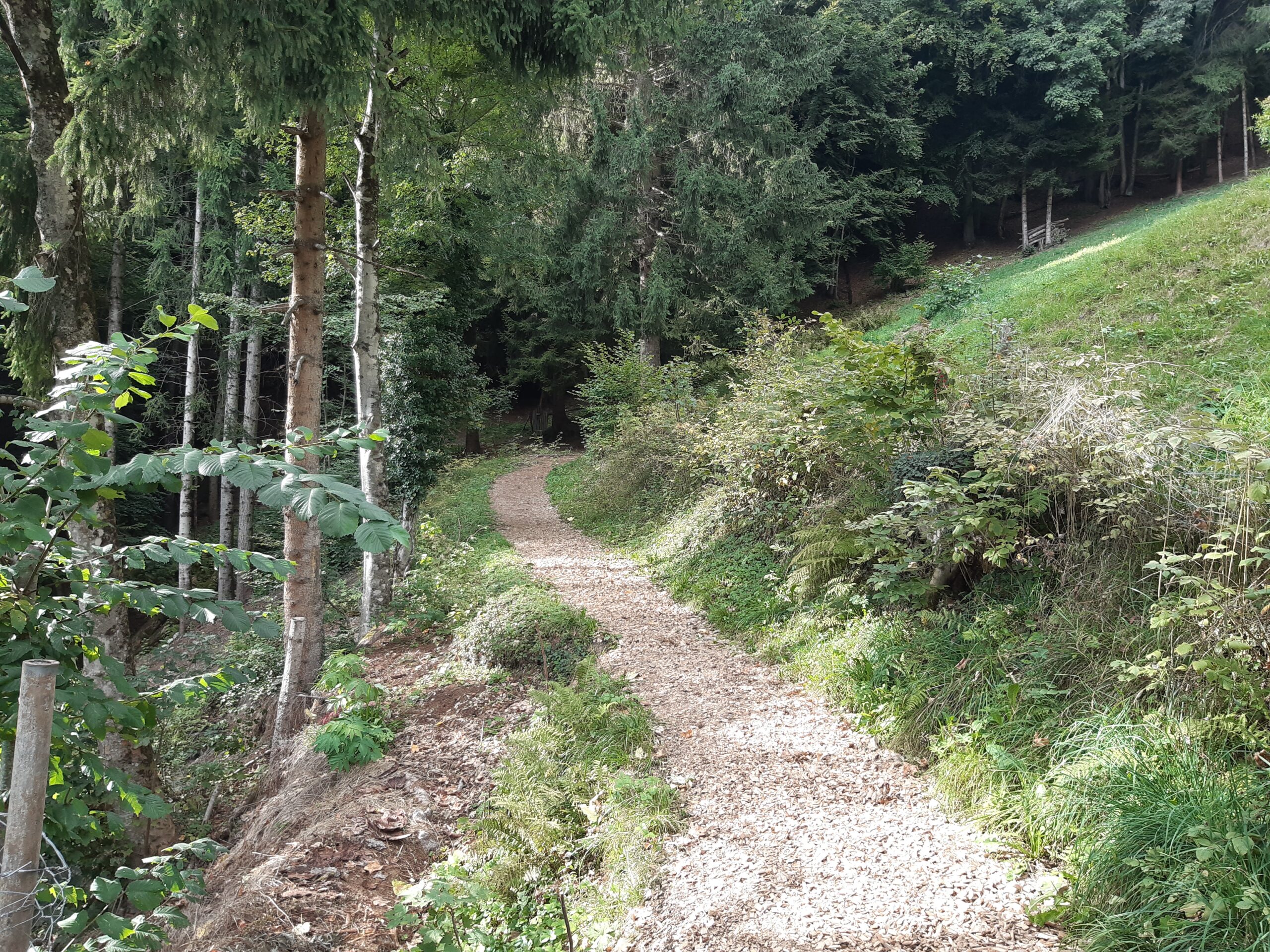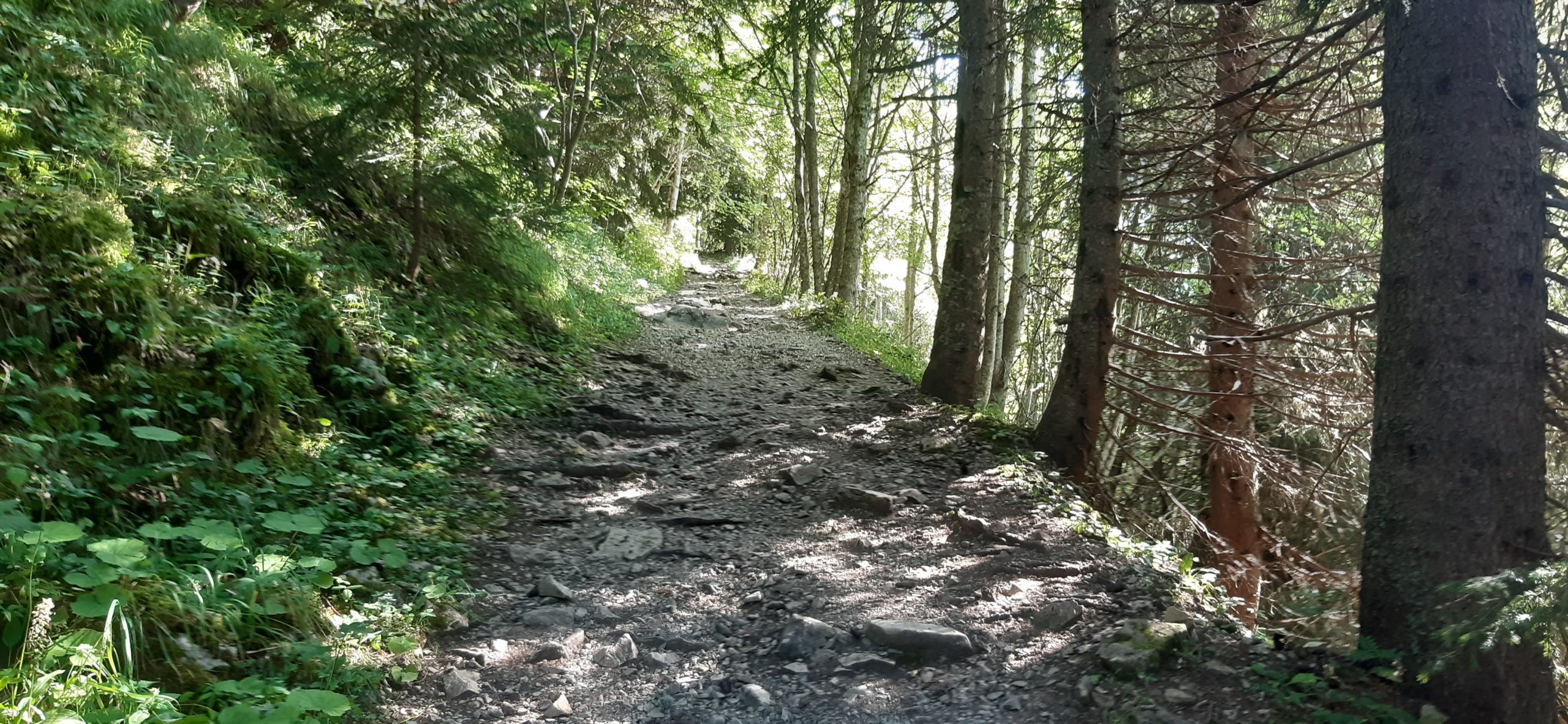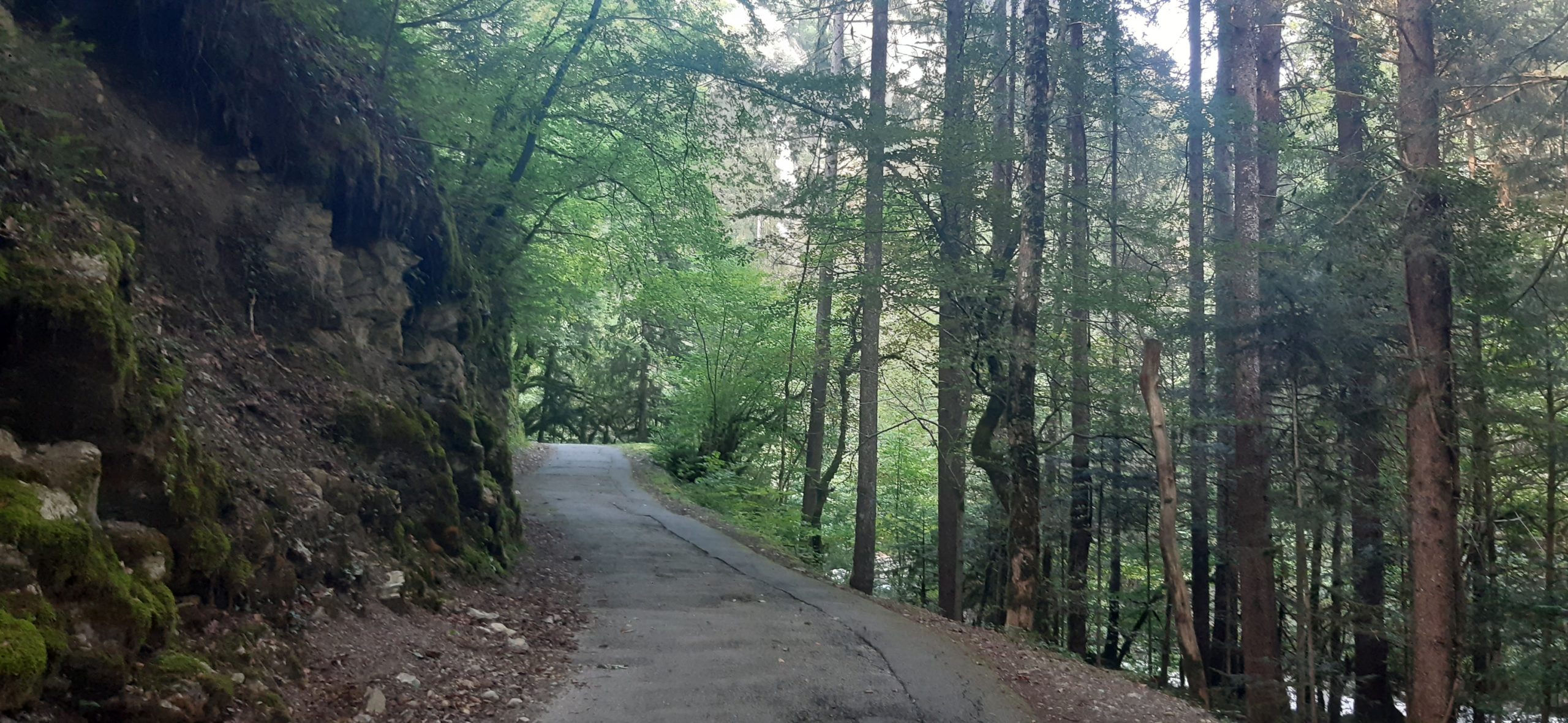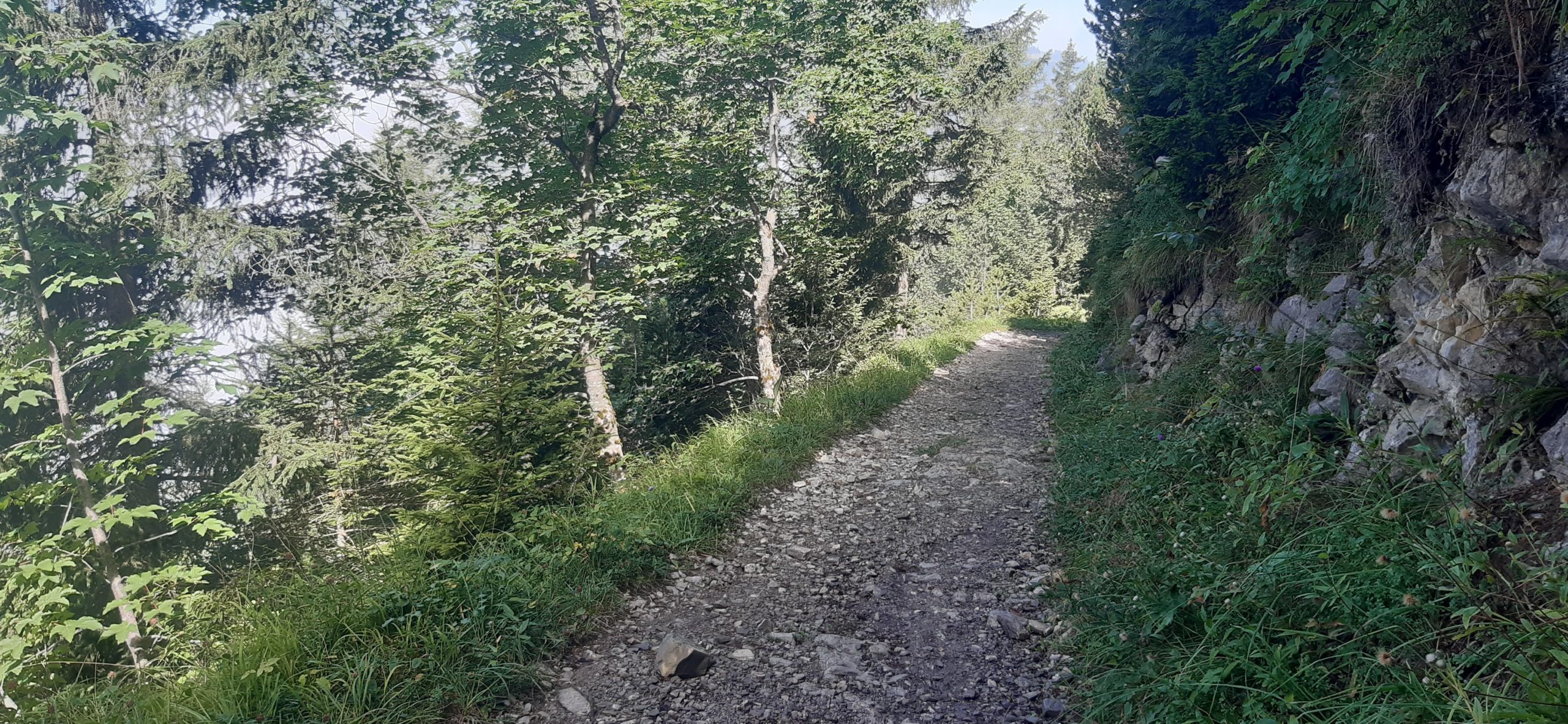 Début de la balade peu ombragé puis dans la forêt ensuite sur un chemin caillouteux (dénivellé négatif d’env 780 mètres)