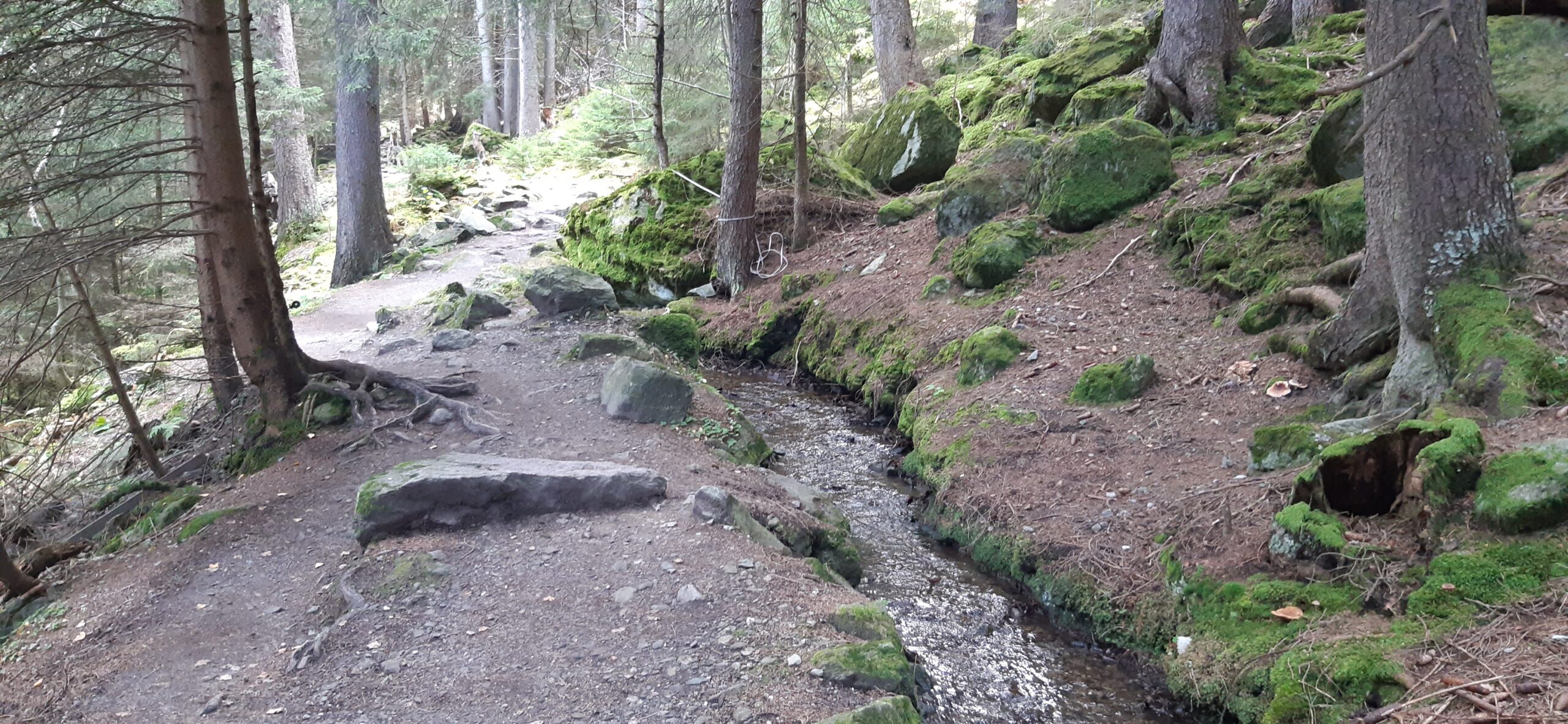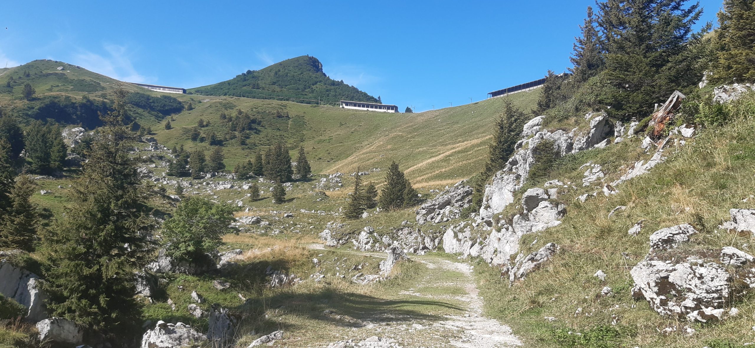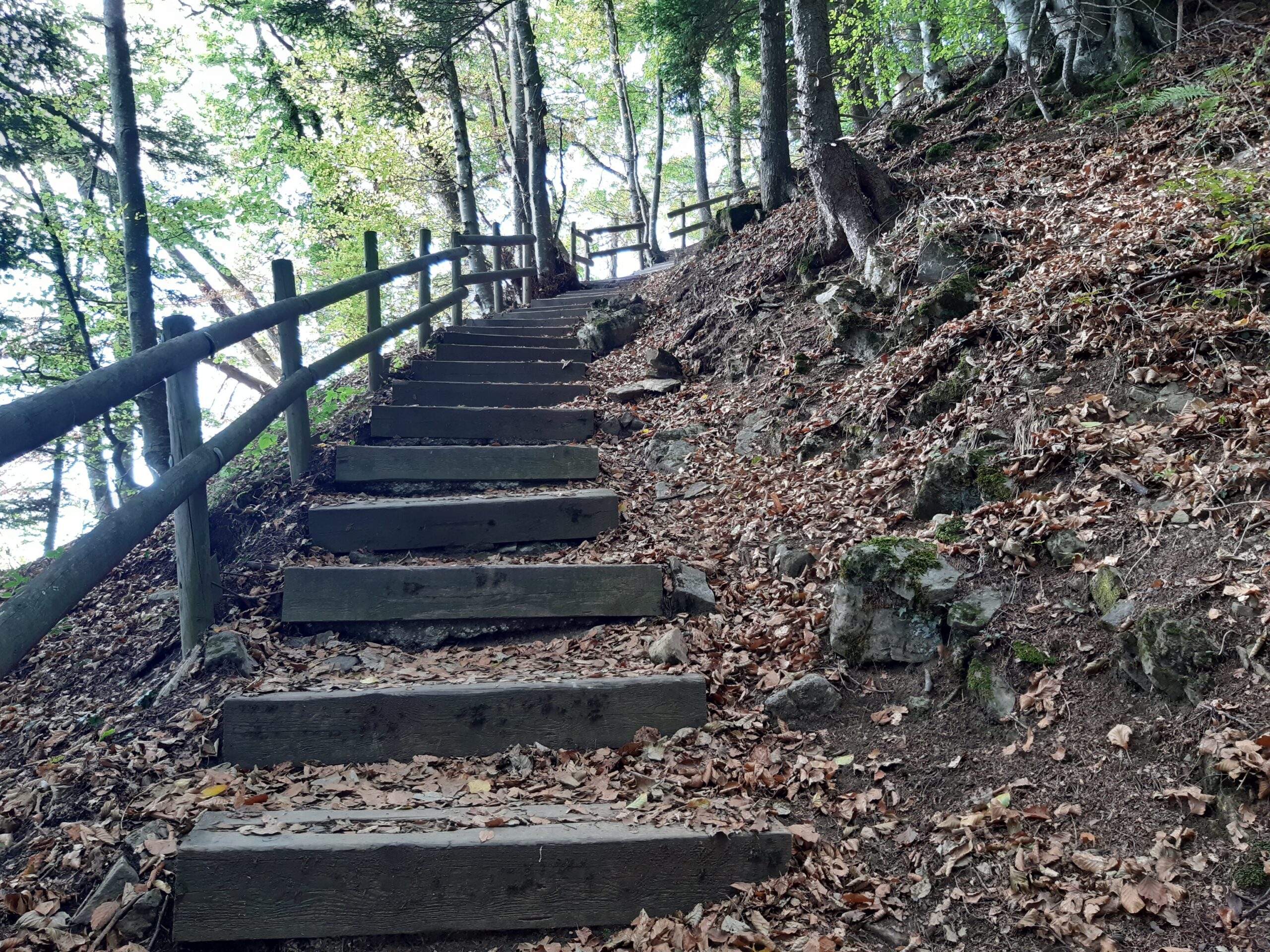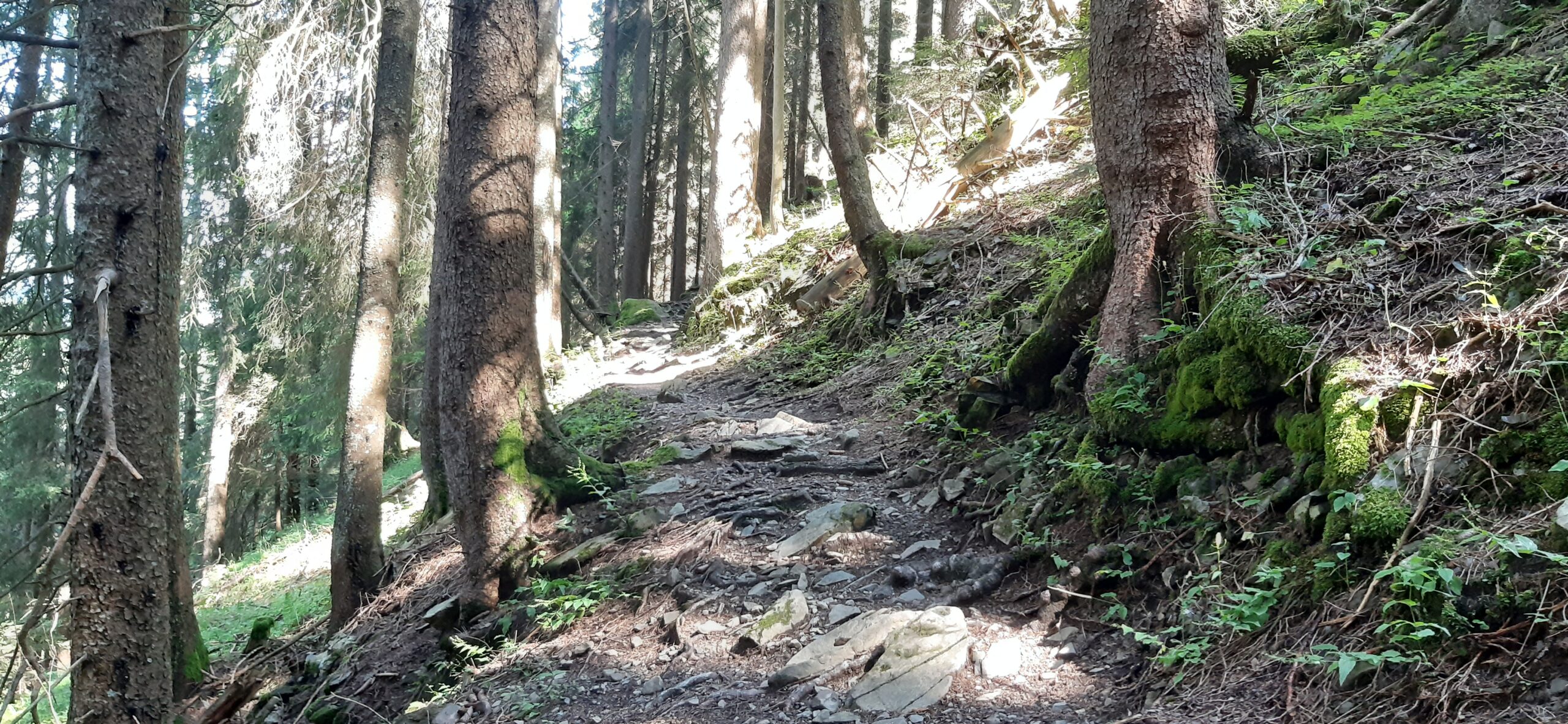 Début de la balade peu ombragé puis dans la forêt ensuite sur un chemin caillouteux (dénivellé négatif d’env 780 mètres)