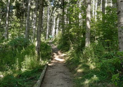 Le chemin serpente dans la forêt avec plusieurs panneaux didactiques et il est possible de s’arrêter pour un pic-nic et/ou pour admirer le point de vue à la cabane du Scex (place de pic-nic).