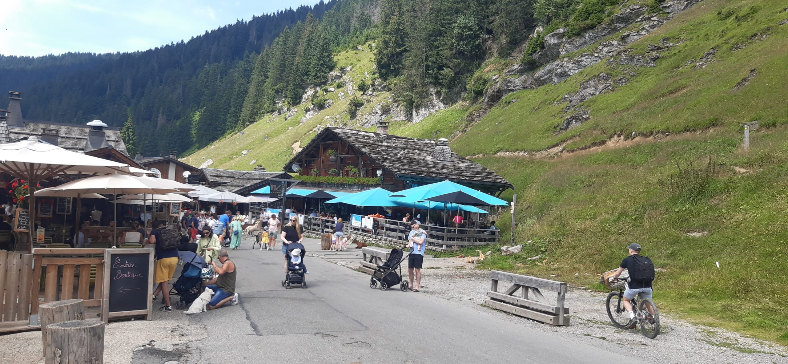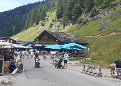 Marche de 2h dans la vallée jusqu’aux Lindarets – village des chèvres (suivre Avoriaz ou Montriond), sur un chemin caillouteux, peu ombragé (dénivellé négatif modéré)
